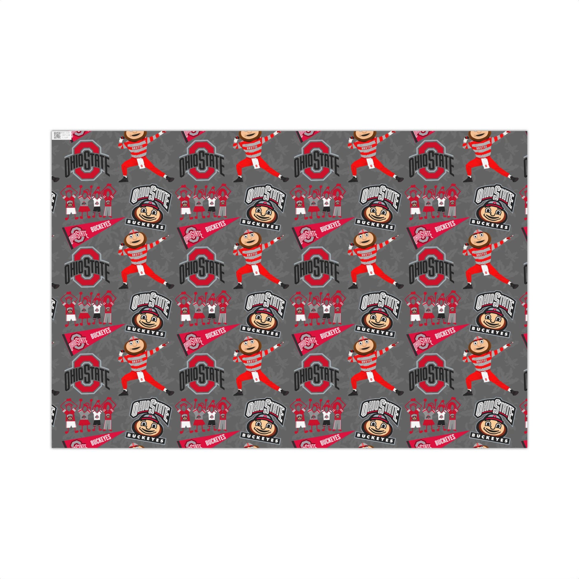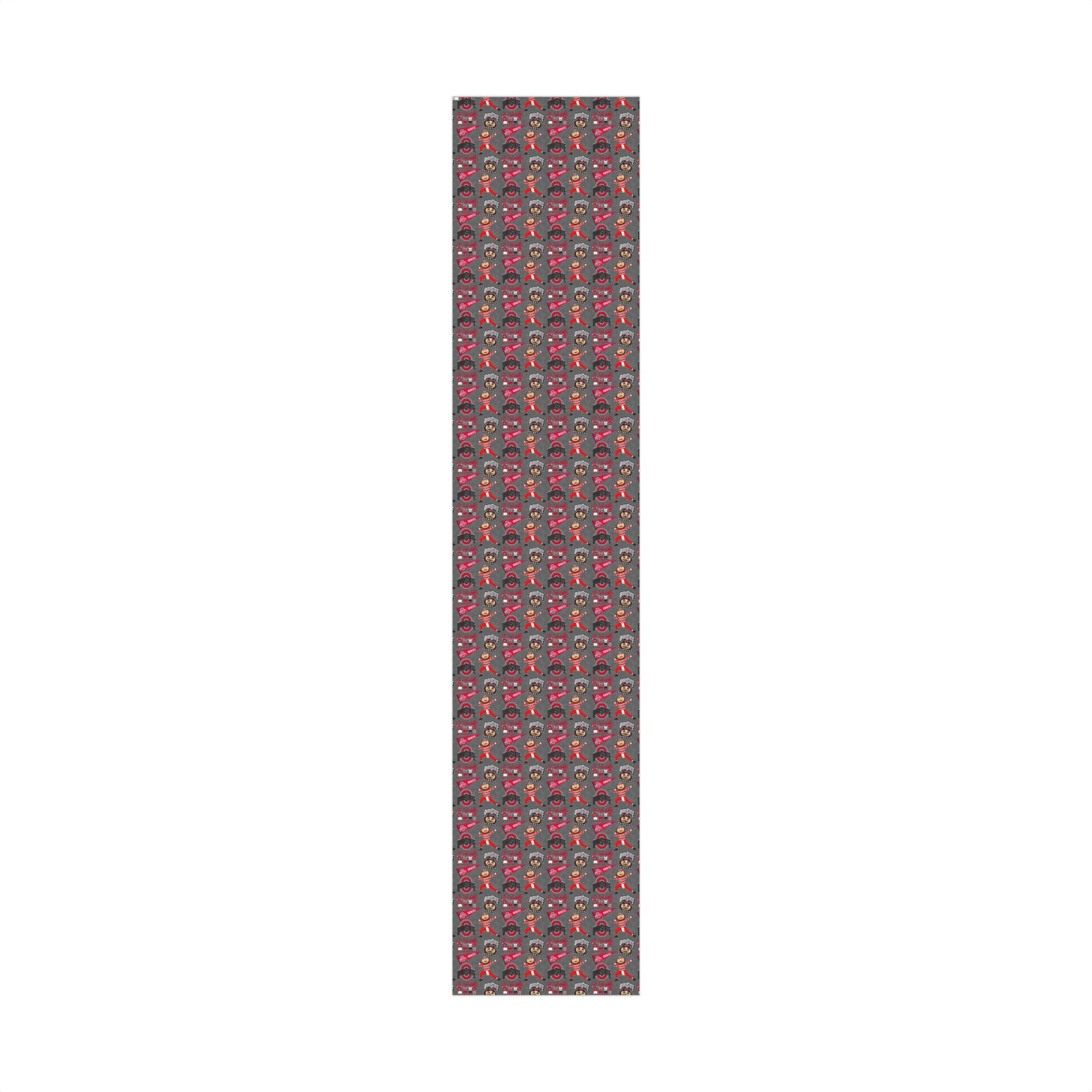 Gray gift wrap patterned with spirited Ohio State motifs. Cheerful illustrations of the mascot, block O logos, and pennants repeat across a durable sheet that holds vibrant scarlet and charcoal inks without fading. The texture choices—satin for a soft sheen or matte for understated elegance—let the design read clearly under holiday lights or daylight. This wrap feels sturdy while folding crisply around corners, and its water- and scratch-resistant finish keeps packages looking neat through shipping or celebration. Printed with water-based, Greenguard UL certified inks and made from recyclable paper, it brings team pride to birthdays, game-day gatherings, and alumni reunions with dependable performance and bold color.